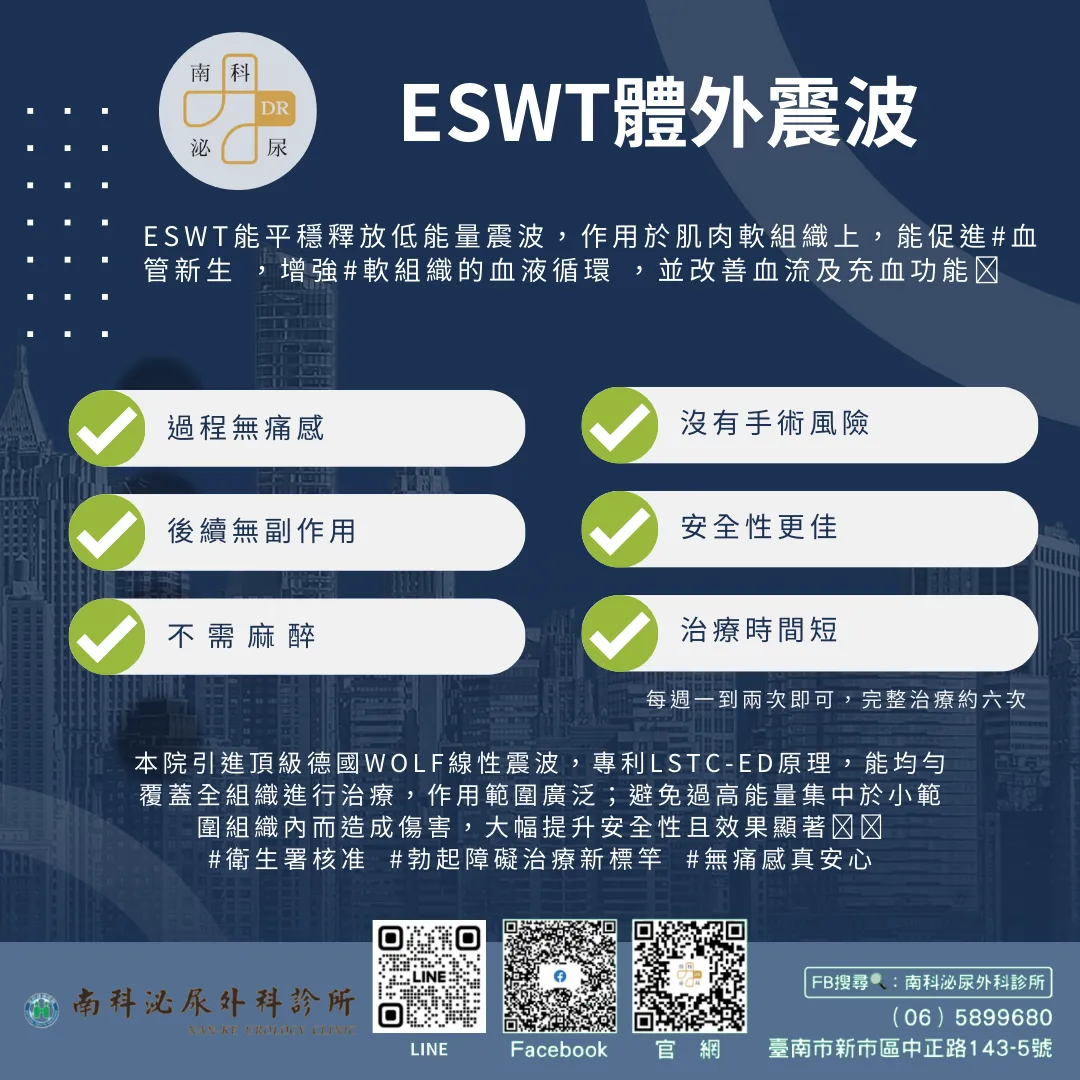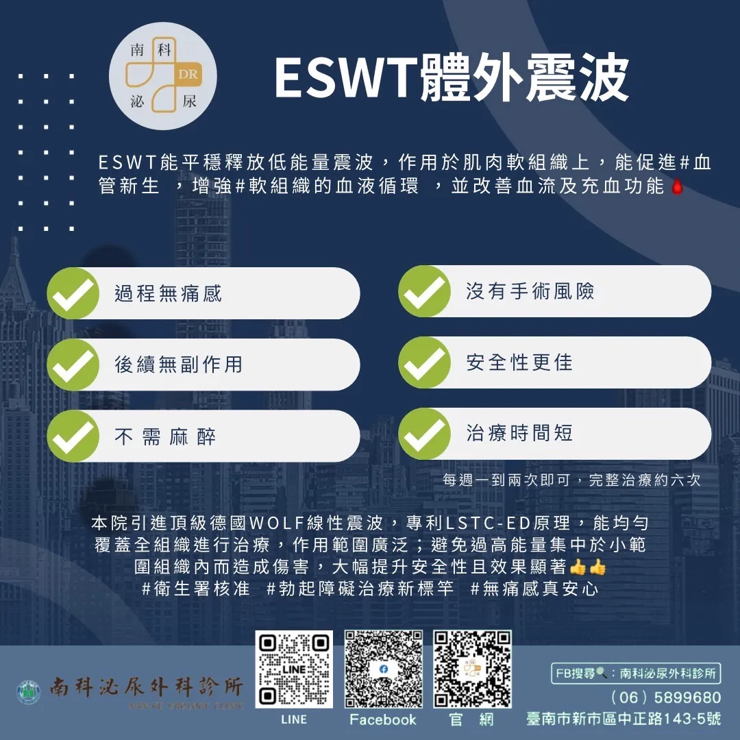 《ESWT體外震波》 ESWT能平穩釋放低能量震波,作用於肌肉軟組織上,能促進#血管新生 ,增強#軟組織的血液循環 ,並改善血流及充血功能 過程無痛感 後續無副作用 不需麻醉 沒有手術風險 安全性更佳